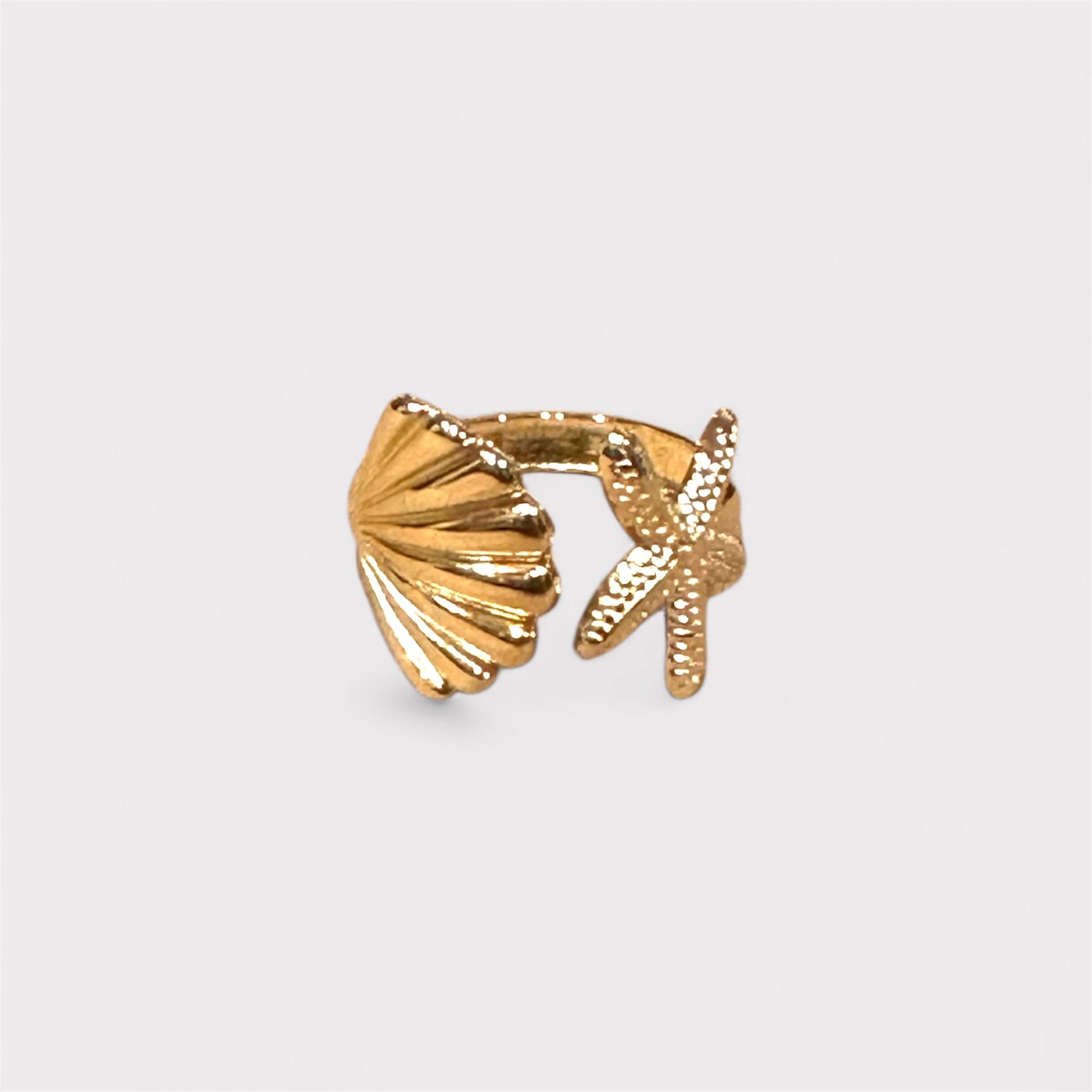 O anel Maré Alta traz de um lado uma delicada concha marinha e do outro uma charmosa estrela do mar, em um design aberto e ajustável que se adapta com conforto a qualquer dedo. Com acabamento dourado ou em prateado e traços suaves como as ondas, é a joia perfeita para carregar o oceano com você o verão todo.