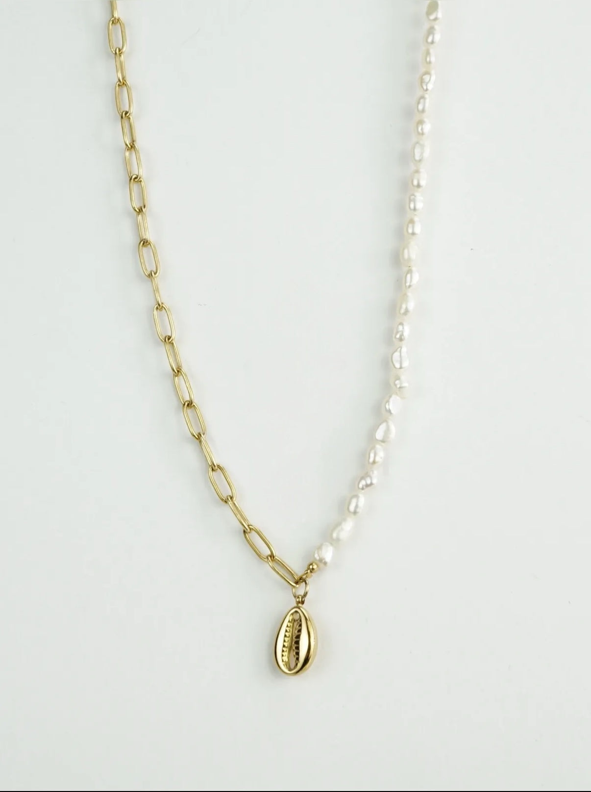 Colar e pulseira com pendente de caracol em aço inoxidável com pérolas naturais e elos.