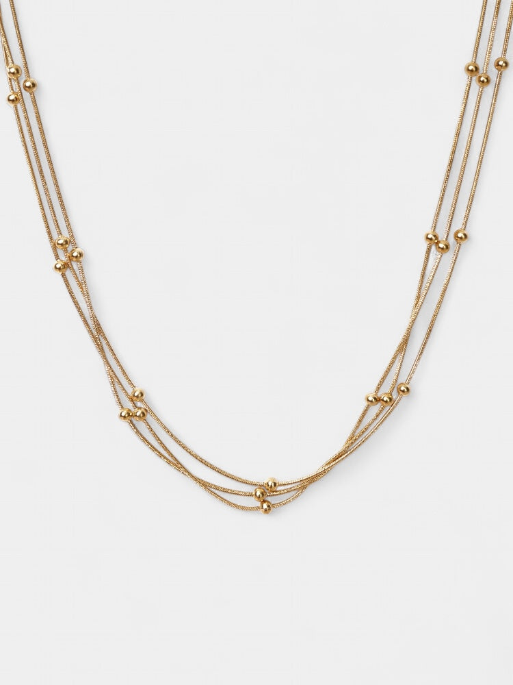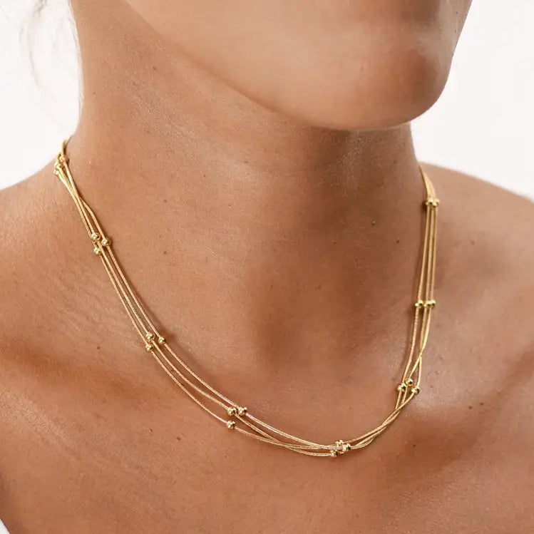 Colar de aço inoxidável multicadeia com bolas, revestimento de nitreto de titânio 0.3-0.5 um e ouro 0.95 um, livre de níquel e chumbo, proporciona uma longa duração.