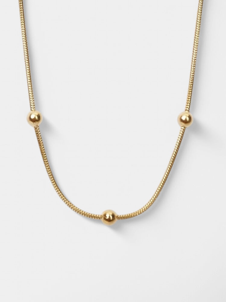Colar em aço inoxidável com corrente e bolinhas. Revestimento de nitreto de titânio de 0,3-0,5 um e ouro de 0,95 um, sem níquel e chumbo, o que lhe confere uma longa vida útil.