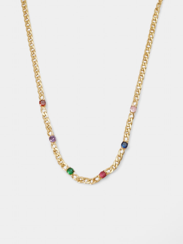 Colar de aço inoxidável, elos com cristais coloridos. Revestimento de nitreto de titânio 0.3-0.5 um e ouro 0.95 um, livre de níquel e chumbo, proporciona uma longa vida útil.