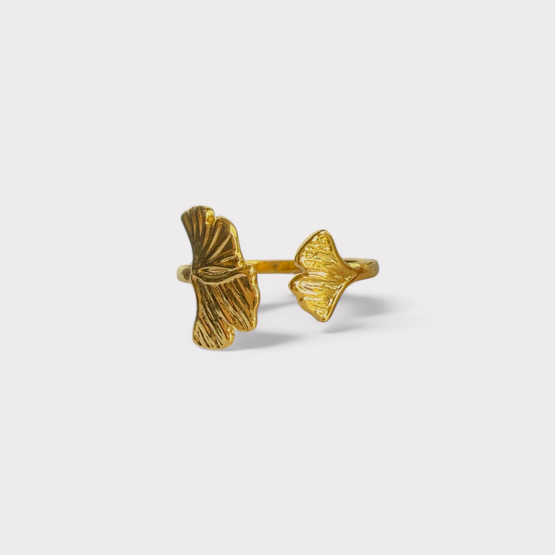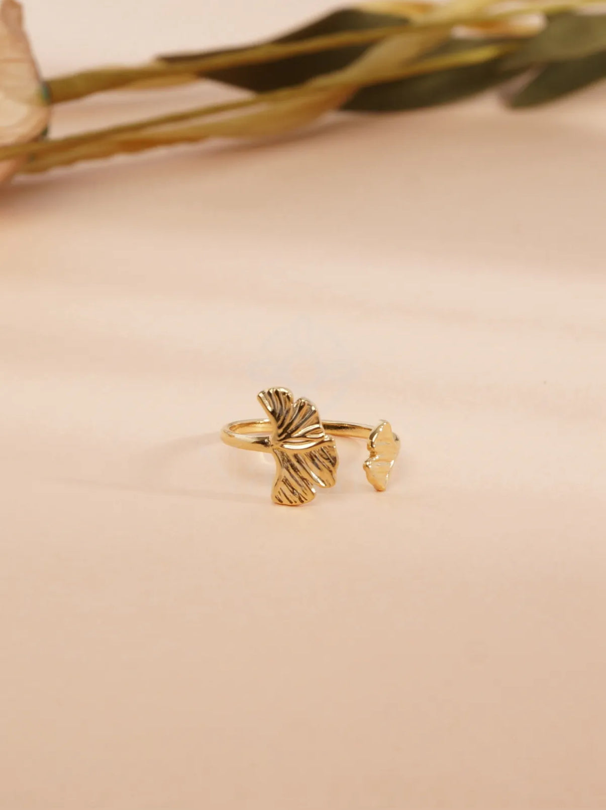 Anel delicado com folha de ginkgo, símbolo de resiliência e beleza natural. Um toque minimalista e poético, ideal para o uso diário ou como presente significativo.