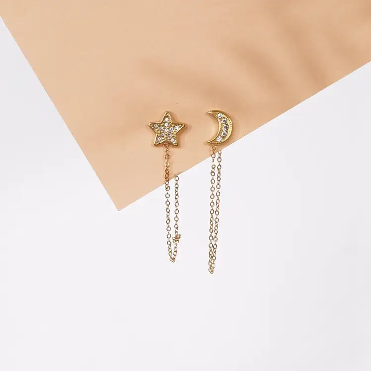 Brincos de aço inoxidável Estrela e Lua com corrente dourada brincos de aço inoxidável estrela e lua com corrente dourada material: aço inoxidável, revestimento de nitreto de titânio 0.3-0.5 um e ouro 0.95 um, livre de níquel e chumbo, proporciona uma longa duração.