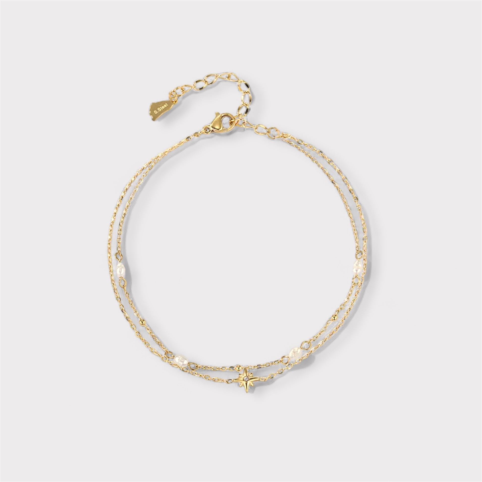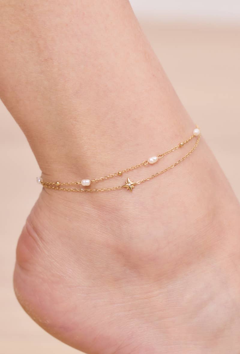 A pulseira Estrela do Litoral traz um pingente de estrela do mar em dourado, emoldurado por pequenas pérolas que pontuam a corrente. Um símbolo da feminilidade livre e luminosa, essa tornozeleira é feita para brilhar sob o sol e encantar em cada passo.