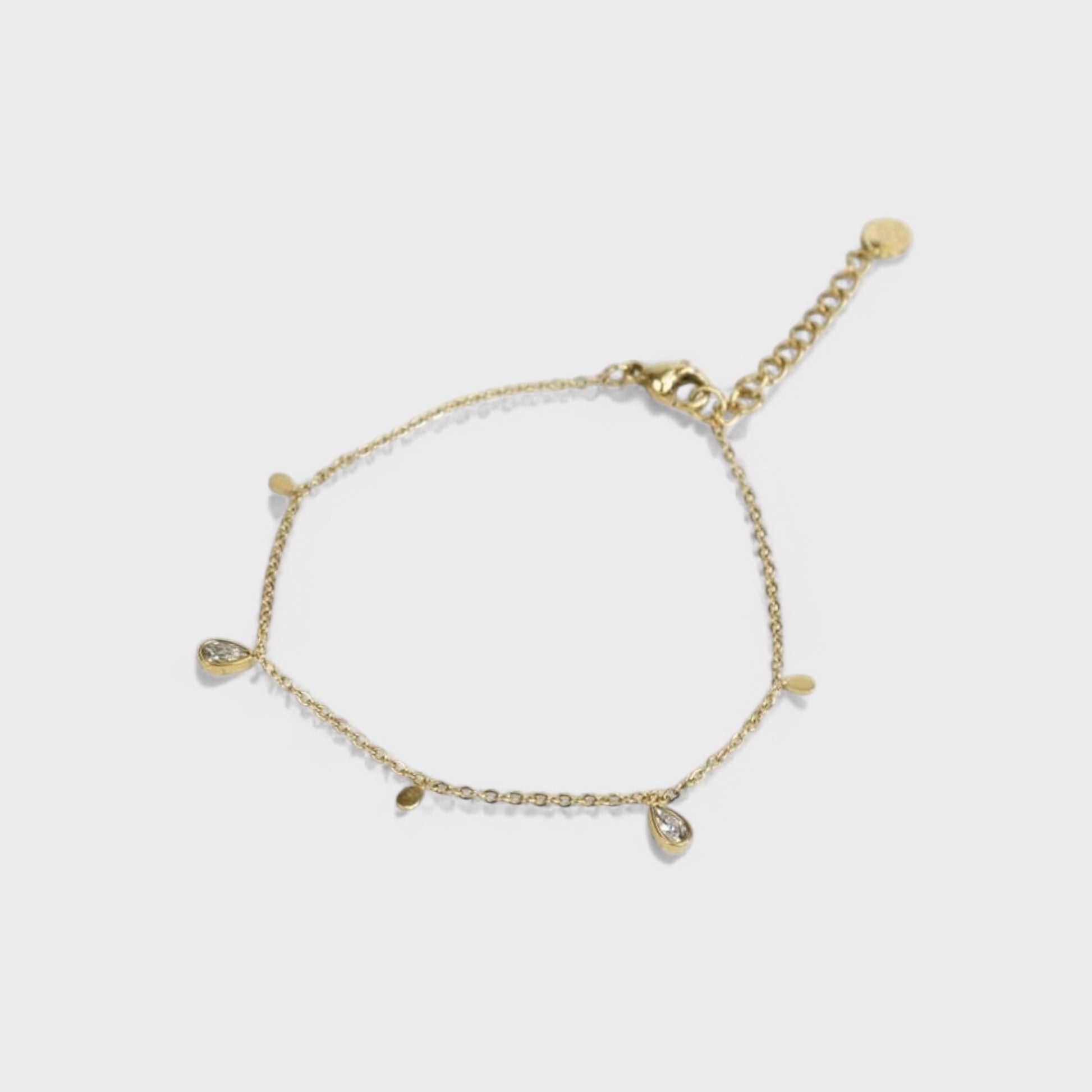 Pulseira de aço inoxidável com charms de zircónio em forma de lágrima.