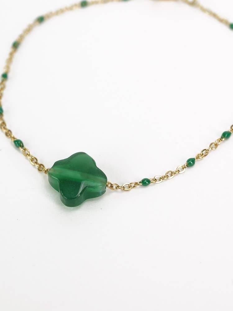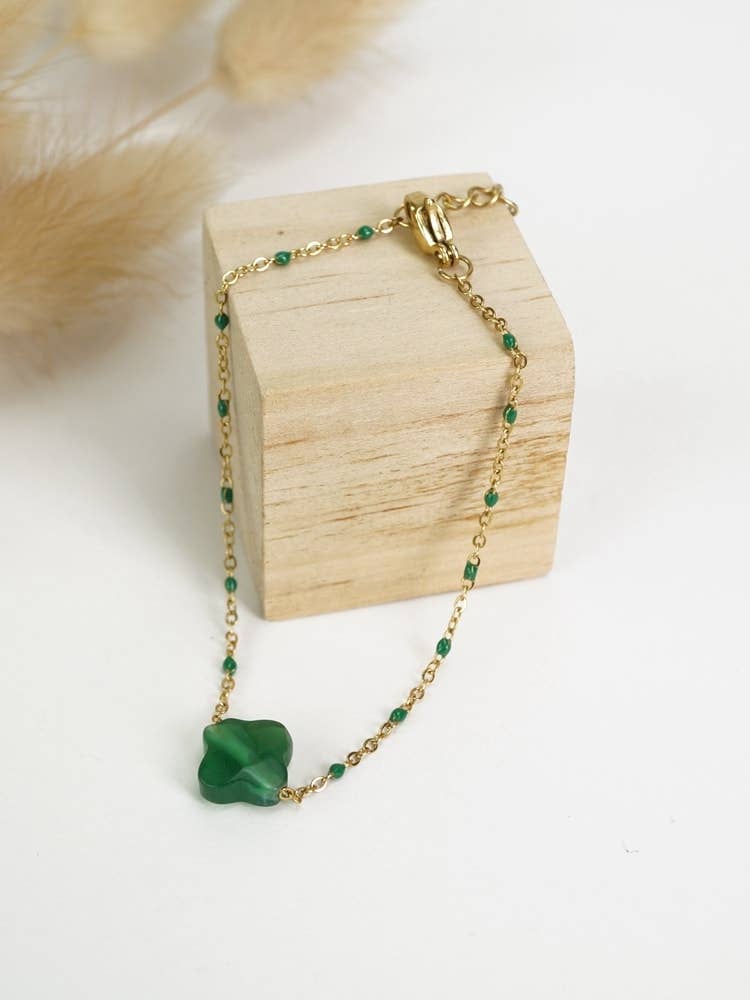 Pulseira de aço inoxidável com trevo de pedra natural e esmalte.