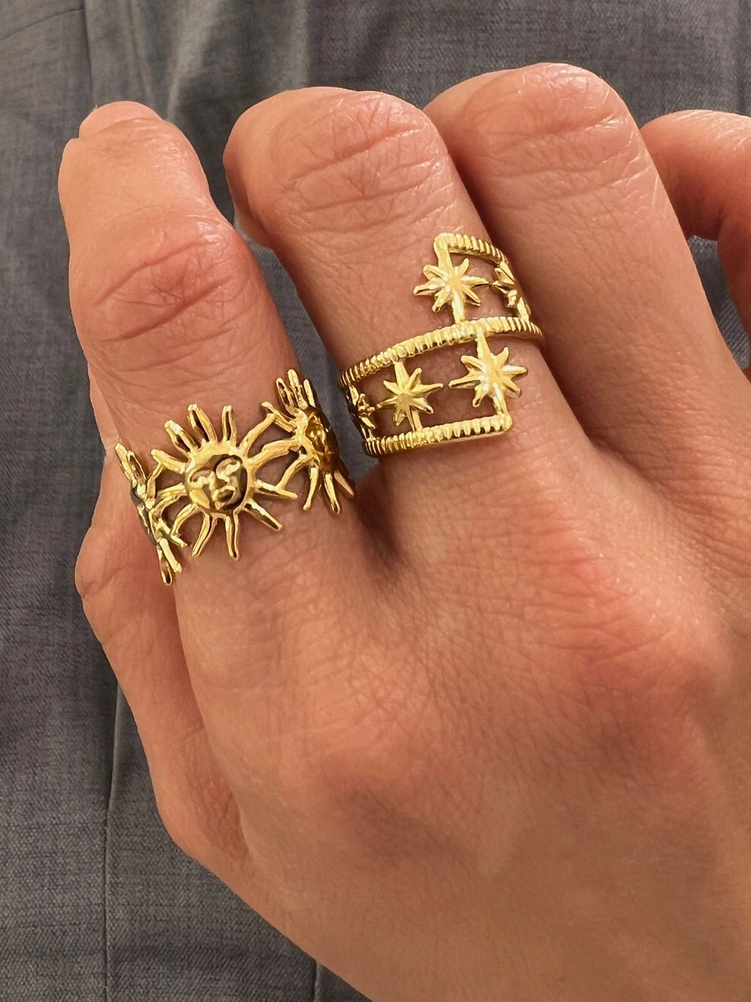 O anel Sol de Verão traz um design exclusivo inspirado nos raios solares. Dourado e com detalhes texturizados que capturam a luz, ele é a peça ideal para looks leves e solares. Use sozinho ou em composição com outros anéis para um visual vibrante e marcante.